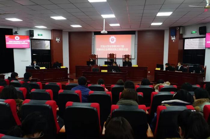 通过合议庭介绍案件基本情况(合议庭组成,原被告,案由等)、法庭调查(原告宣读起诉书,被告宣读答辩意见,双方举证质证)、法庭辩论(原被告围绕合议庭归纳的争议焦点进行辩论)、原被告双方作最后陈述等环节,进行模拟展示的同学们表现出对案件事实深刻的分析理解、清晰的逻辑思路和场上良好的心理素质及精神面貌。同学们以“毕胜宿”“毕胜客”作为被告诉讼代理人姓名、“甄正义”“甄公平”作为法官姓名更是增添了模拟庭审活动表演的生动趣味。
