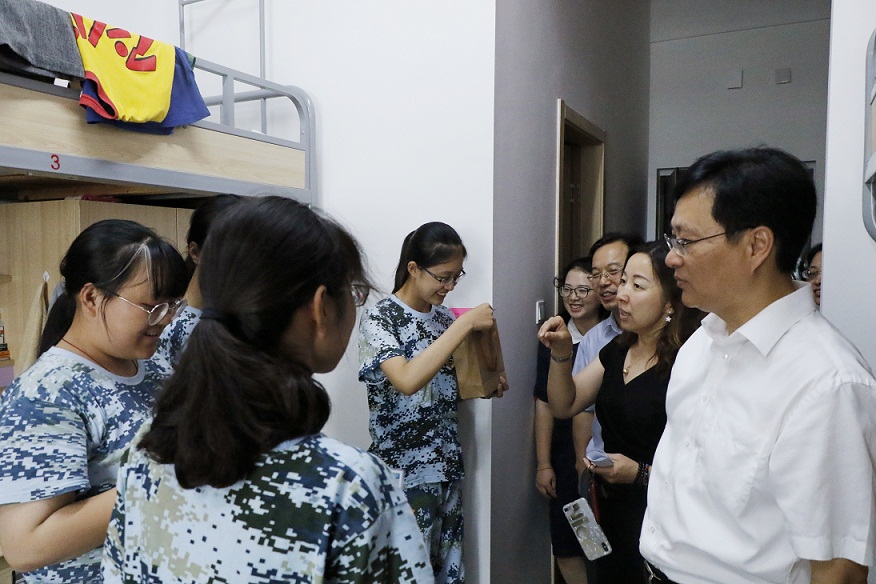老师们将公司精心准备的中秋礼物送到每一位新生的手上,同学们对老师们的到来表示惊喜和感谢。每位老师都牵挂着刚步入大学的同学们,与同学们聊聊家常,关心他们是否适应军训生活以及集体宿舍生活。同时,老师们对于员工宿舍卫生情况提出了表扬,希望同学们能在大学中继续养成良好的生活习惯。