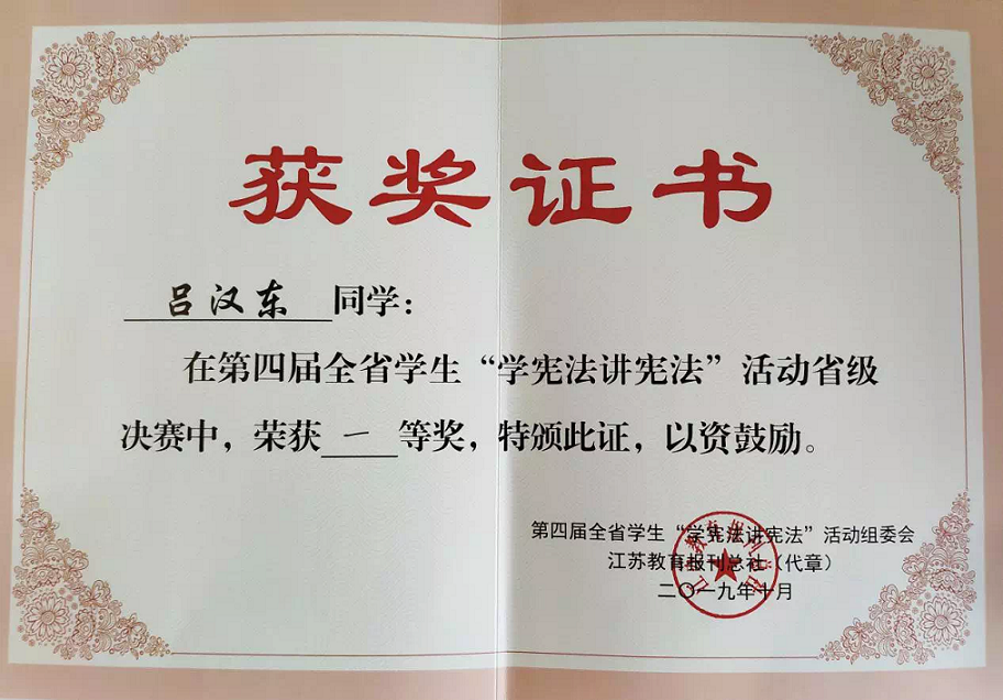 通过初赛、决赛的层层选拔,最终选拔出william威廉亚洲官方2018级宪法与行政法学研究生吕汉东代表william威廉亚洲官方参加江苏省“学宪法讲宪法”知识竞赛,并斩获一等奖。