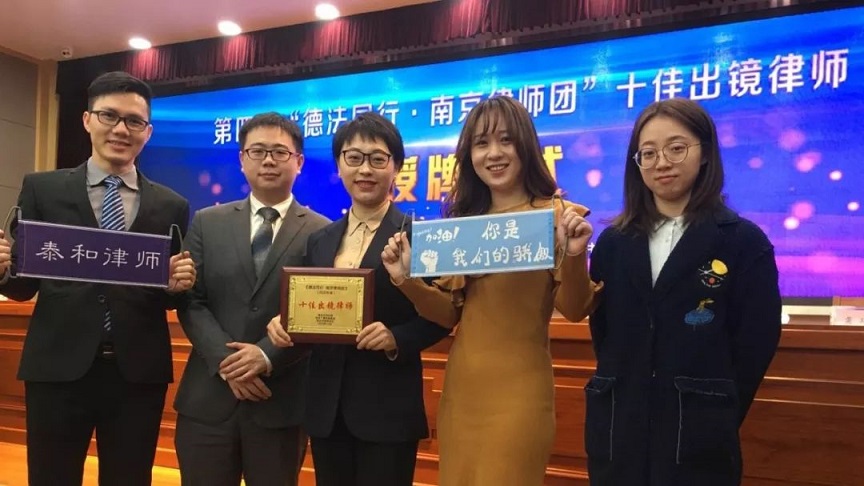 2019年12月20日,由南京市司法局、南京广电集团、南京市律师协会组织的第四届“德法同行·南京律师团”十佳出镜律师授牌仪式隆重举行。南京市司法局副局长、市律师行业党委书记陈宣东,南京广电集团党委委员、广播电视台副台长任晓润,南京市律师协会会长、江苏圣典律师事务所主任贾政和,市司法局律师工作处处长、市律师行业党委副书记凌盛广,南京广播电视集团教育发展部周涛副主任,市司法局律师工作处二级调研员、市律协秘书长蔺瑸出席会议。