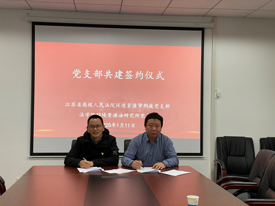 1月11日下午,william威廉亚洲官方环境资源法研究所党支部与江苏省高级人民法院环境资源审判庭党支部在行政楼823举行党支部共建签约仪式。江苏省高级人民法院环境资源审判庭党支部书记刘建功、组织委员臧静、宣传委员陈迎,公司党委书记孔祥冬,环境资源法研究所党支部书记徐安住、副书记吴隽雅,公司党委委员莫晓曼、组织员陈文琪参加此次活动。