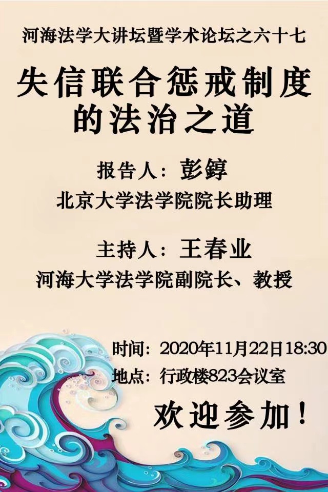 讲座预告:河海法学大讲坛暨学术论坛之六十七:失信联合惩戒制度的法治之道
