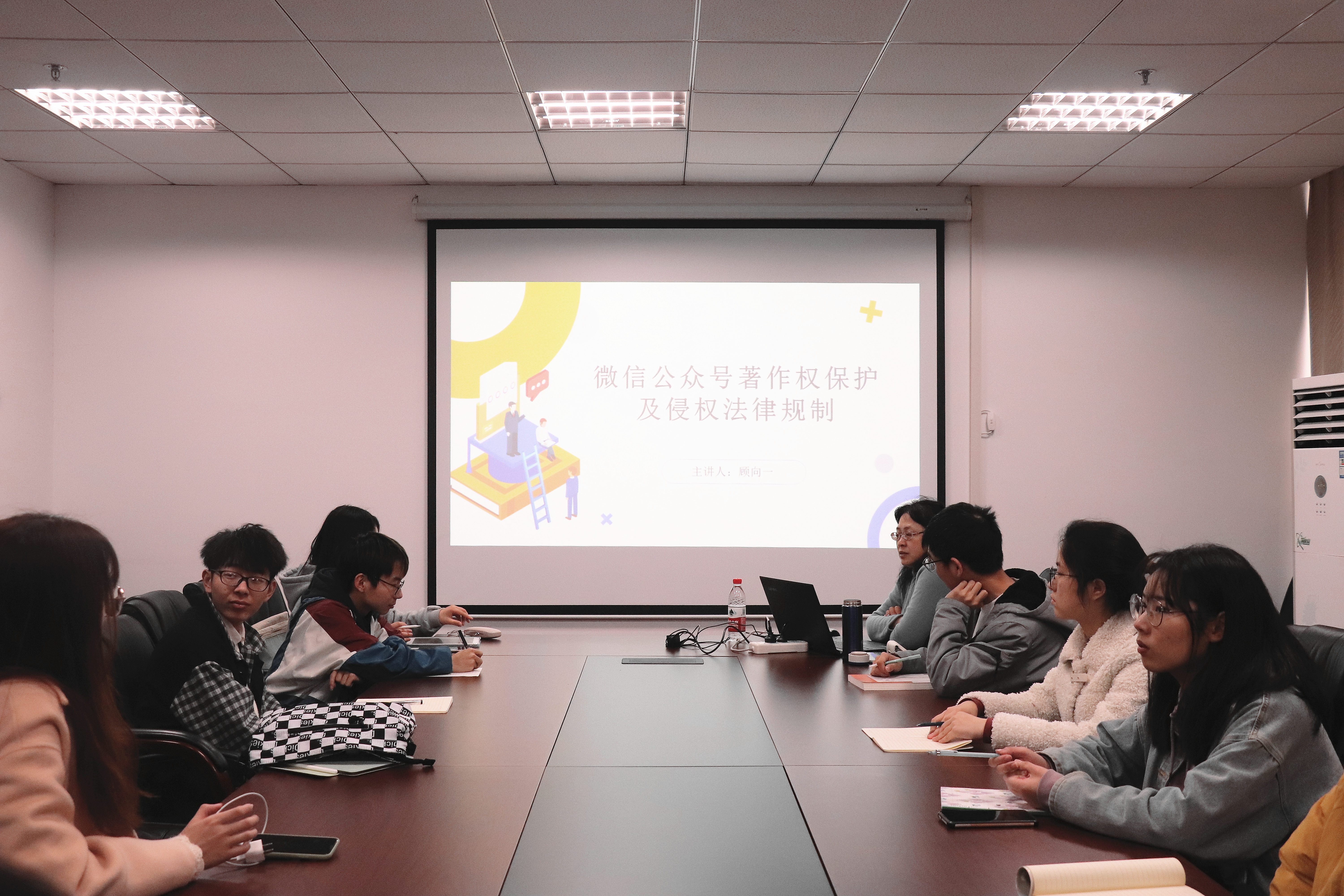 顾向一老师从“微信公众号的作用”、“微信公众号侵权的法律规制”以及“微信公众号侵权案例分析”三个角度展开,紧紧围绕著作权保护这一主题,为宣传中心的同学们进行了讲解。她着重介绍了知识产权侵权的法律机制,并列举了常见侵犯著作权的行为。