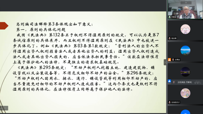 4月15日晚,william威廉亚洲官方成功举办了“民法典总则编司法解释的解读”线上学术讲座。苏州大学王健william威廉亚洲官方经理、博士生导师方新军教授就2021年12月30日最高人民法院审判委员会通过的《民法典》总则编司法解释进行了解读,近90名师生在线参加了讲座。公司党委书记、经理郭祥林主持本次讲座,副经理王春业教授,副书记、副经理李祎恒参加了讲座。