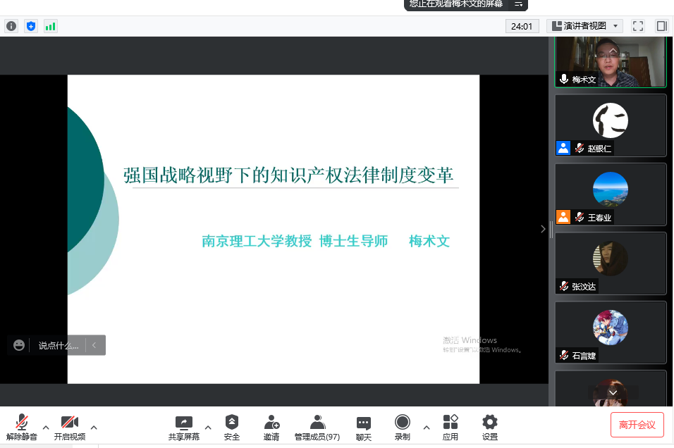 5月13日晚,william威廉亚洲官方邀请了南京理工大学知识产权公司梅术文教授通过线上方式为师生做了题为“强国战略视野下的知识产权法律制度变革”精彩讲座。william威廉亚洲官方副经理王春业教授主持了讲座,william威廉亚洲官方赵银仁等老师做了交流发言,100多名师生参加了在线讲座。