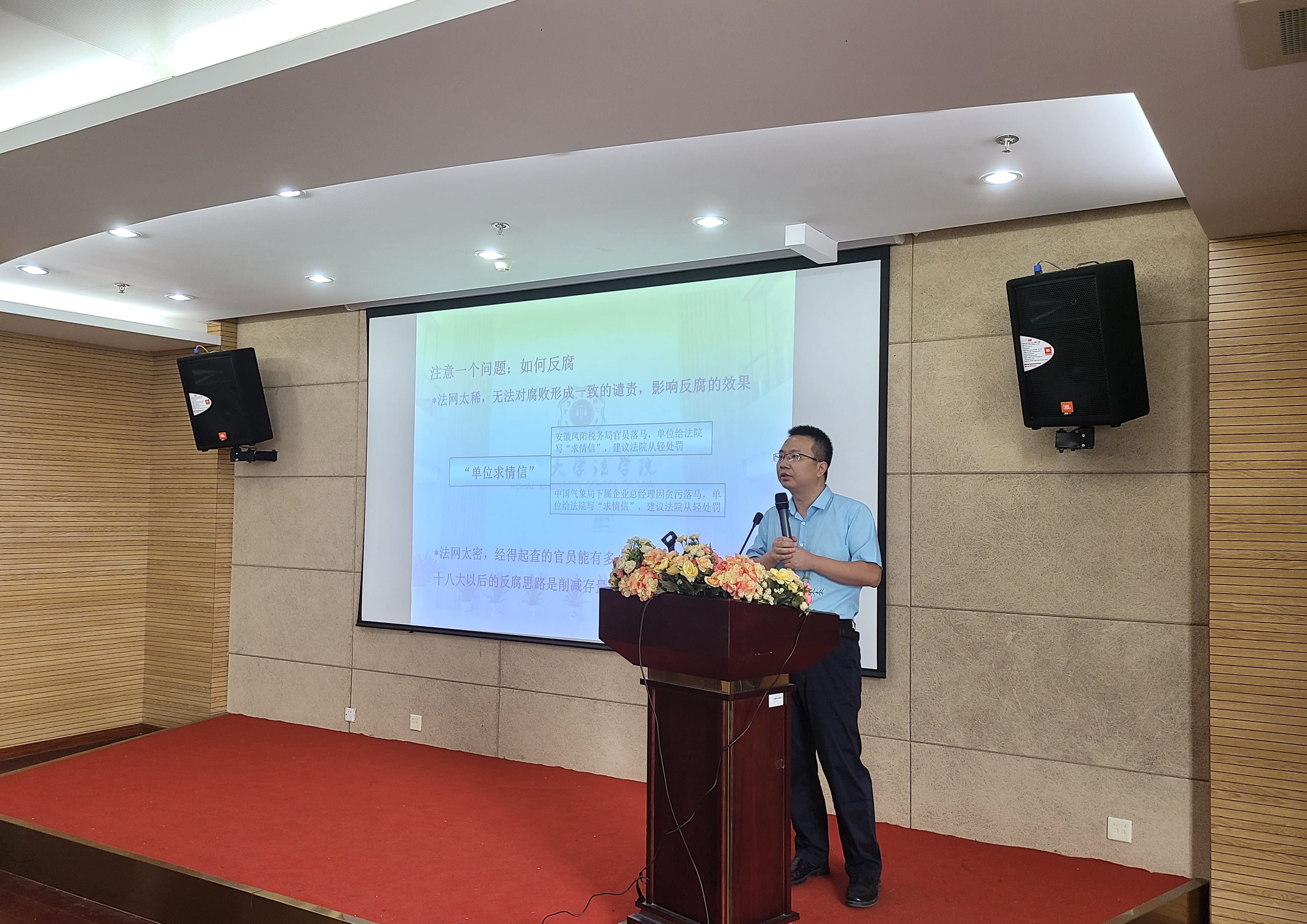 宋伟卫老师从“高压”“威慑”“法治”“信仰”四个关键词为切入点展开,以案释理、旁征博引,立足当前党风廉政建设的新形势,结合反腐案例,深刻剖析了腐败行为背后的法理和价值观问题,详细阐述了现阶段国家反腐的高压态势、腐败惩治的威慑作用、法治反腐的重要地位以及共产党人如何坚定理想信念、防止腐败侵蚀四个方面内容。“腐败惩治的要义在于其威慑与阻吓力,这种力量的发挥主要不在于惩罚的严酷性,而在于惩罚的不可逃避性”。宋伟卫老师指出,在反腐行动中,法治具有极其重要的地位,我们要善于运用法治思维和法治方式反对腐败。