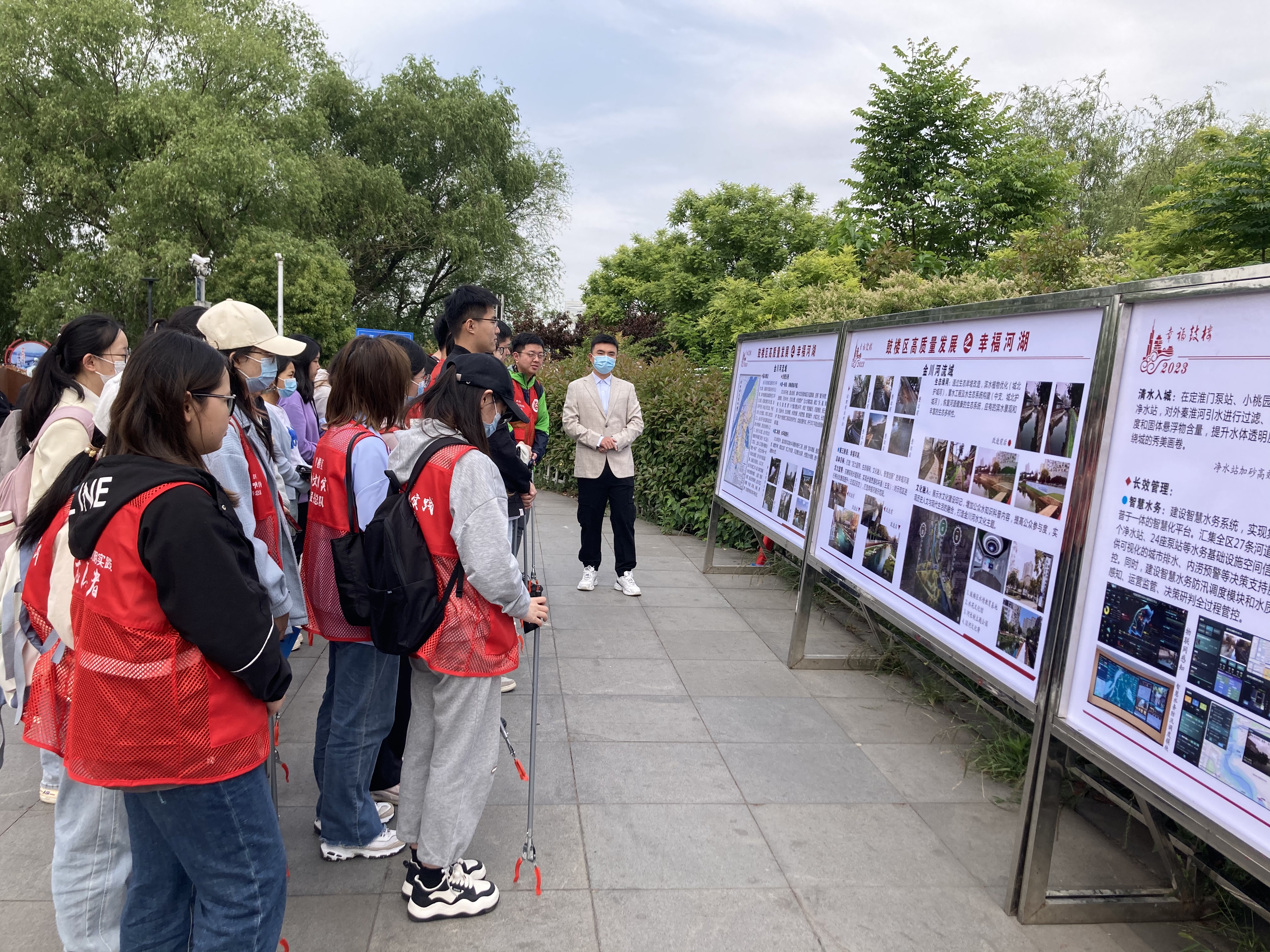 活动伊始,老师与同学们在三叉河河口闸前参观了“鼓楼区高质量发展——幸福河湖“展板,了解长江大保护成果。参观过程中,讲解员为同学们讲解了金川河流域的治理历程:从消除黑臭河道到水环境提升,再到幸福河湖,金川河流域以打造“活力蓝带、生态绿网、文化融入、智慧创新”的幸福河湖为总目标,推行长效管理,倚靠“智慧水务”和“河长制”两大助力,绘就高质量碧水画卷。