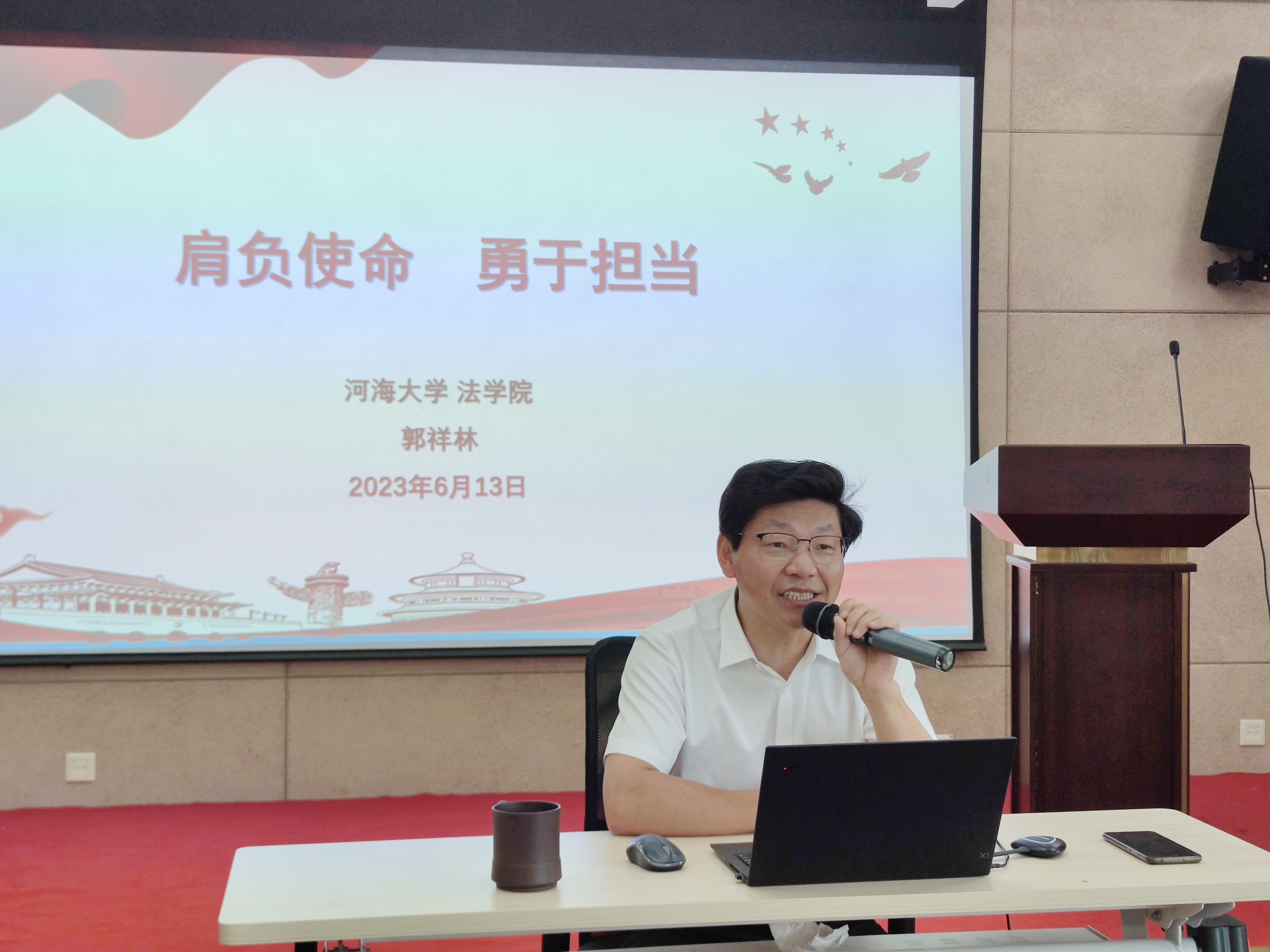 首先,郭祥林书记领学了党的二十大报告中关于“实施科教兴国战略,强化现代化建设人才支撑”“坚持全面依法治国,推进法治中国建设”章节内容、习近平总书记在中共中央政治局第五次集体学习时的重要讲话精神以及中共中央办公厅、国务院办公厅印发的《关于加强新时代法学教育和法学理论研究的意见》内容。通过学原文,一方面带领大家深入学习领会习近平总书记关于教育的重要论述,深刻理解教育、科技、人才是全面建设社会主义现代化国家的基础性、战略性支撑;另一方面引导大家深入学习领会习近平总书记关于全面依法治国的新思想、新观点、新论断、新要求以及党中央关于全面推进依法治国的重要部署。